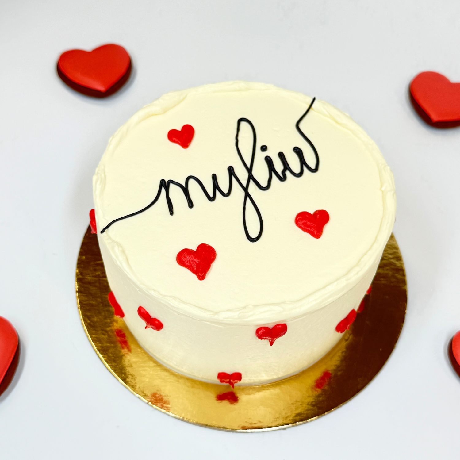 Švelnus, sluoksniuotas medaus tortas su lengvu, kremišku kremu ir subtilia citrinos gaiva, papildyta spanguolių ir vyšnių konfitiūro rūgštele, kuri harmoningai subalansuoja saldumą. Rankų darbo dekoras su užrašu „myliu“ ir raudonų širdelių akcentais – jautri detalė, skirta pasakyti daugiau nei žodžiai.