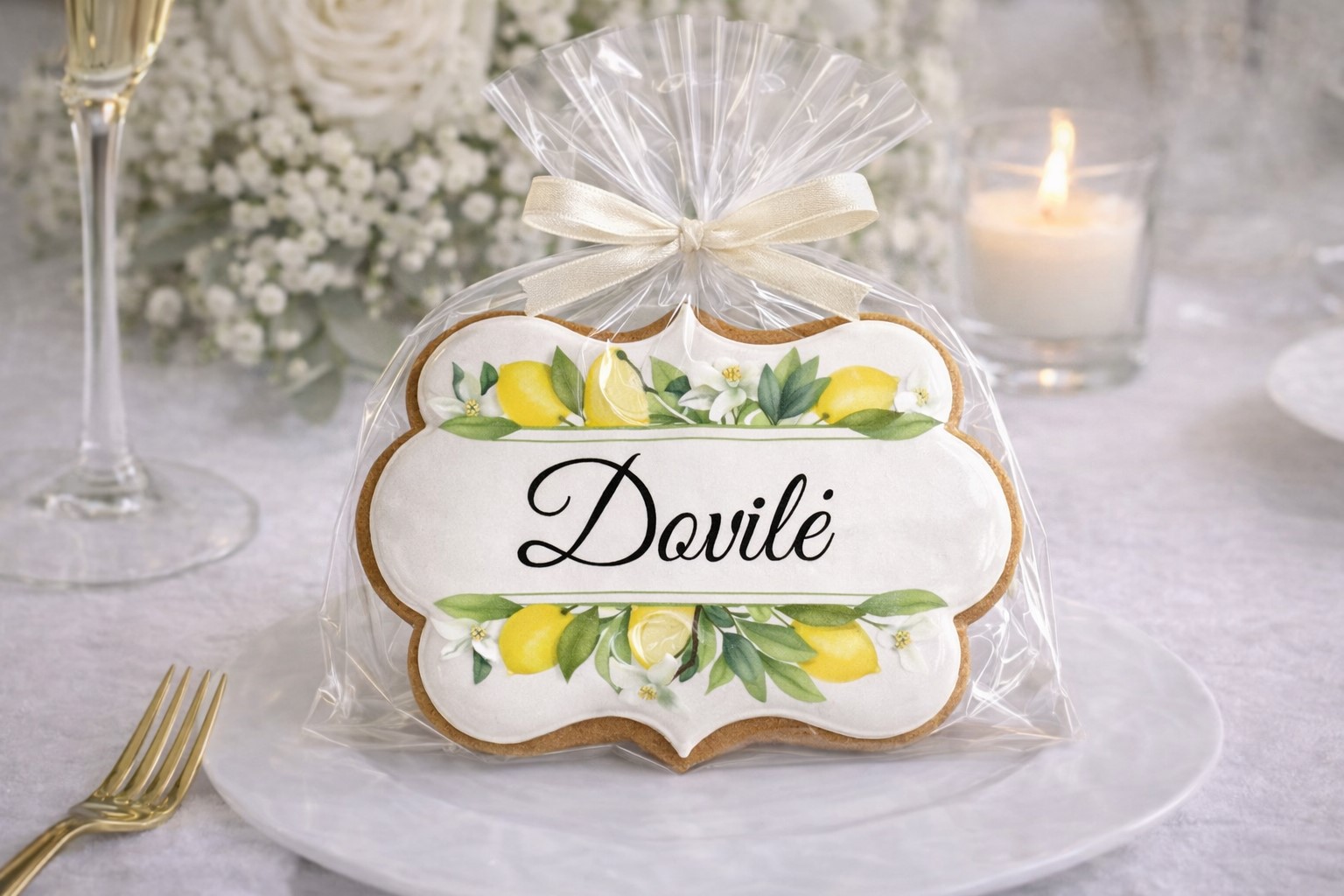 Vestuvių stalo kortelės iš meduolių gali tapti puikia stalo puošmena ir saldžia prisiminimo dovanėle svečiams.